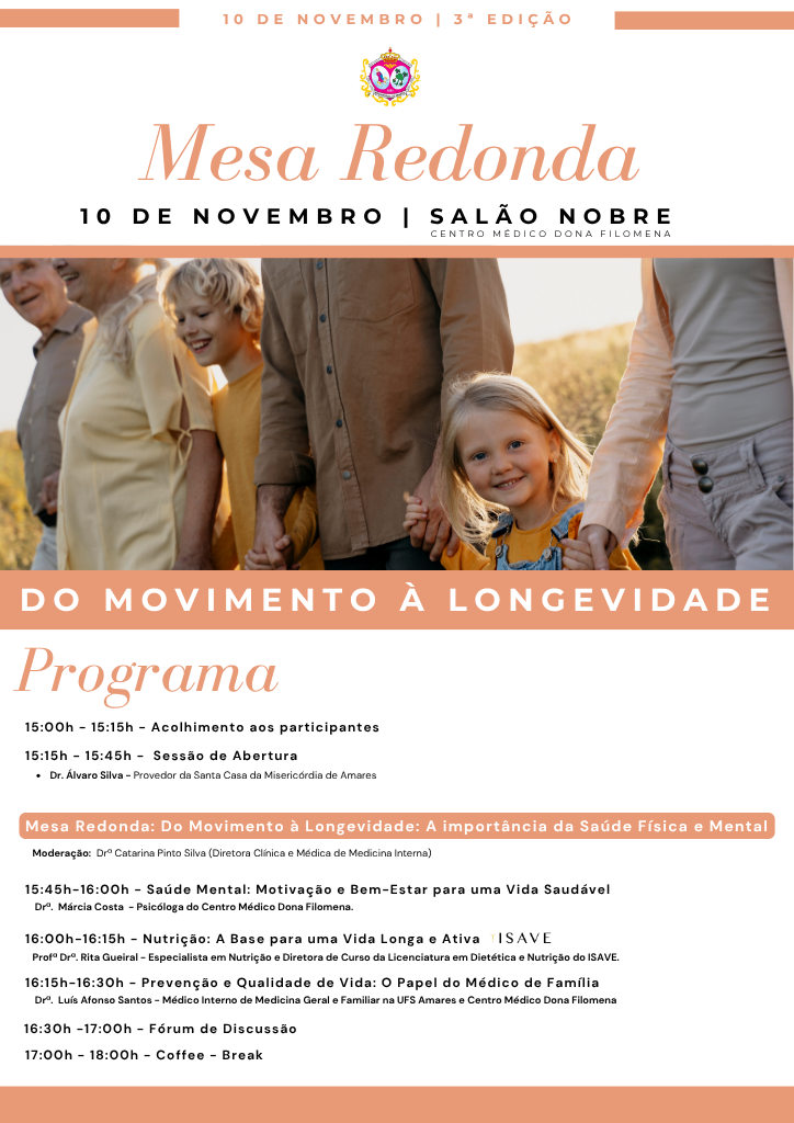 O Centro Médico Dona Filomena vai realizar, no próximo dia 10 de novembro, a 3.ª Edição da Mesa Redonda, subordinada ao tema “Do Movimento à Longevidade: A Importância da Saúde Física e Mental”. O encontro decorrerá no Salão Nobre da clínica, reunindo profissionais e especialistas de diversas áreas da saúde para debater os pilares de uma vida longa e equilibrada.